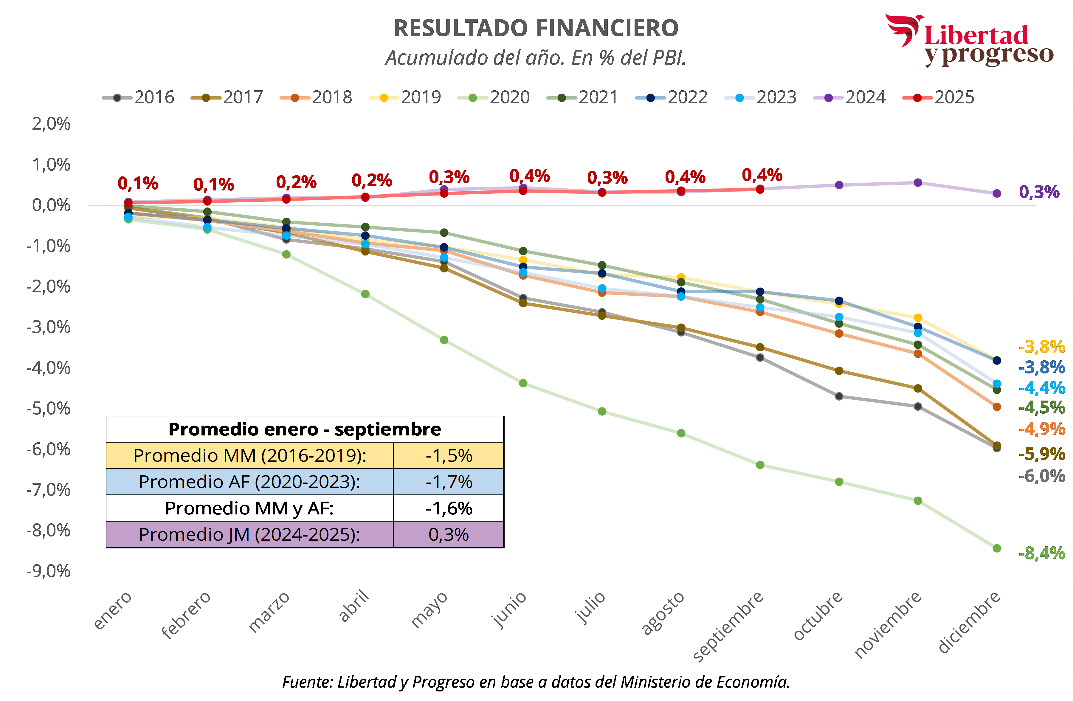 En el gráfico se puede observar el desempeño financiero mensual acumulado entre 2017 y 2025. Sólo 2024 y 2025 exhiben superávit financiero al mes de septiembre, cuando vemos que entre 2017 y 2023 siempre la regla fue tener un déficit fiscal creciente mes a mes.