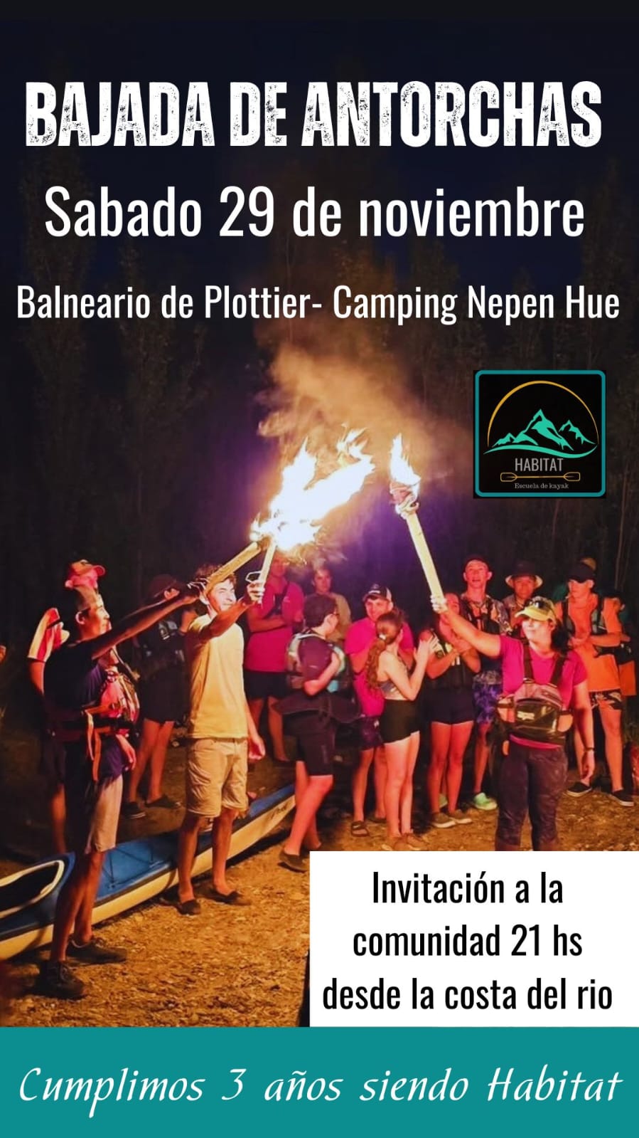 La tradicional “Bajada de Antorchas” en el río Limay de Plottier se realizará nuevamente este año. El evento, organizado por la Escuela de Kayak Hábitat, se desarrollará el sábado 29 de noviembre y se podrá disfrutar a partir de las 21hs aproximadamente.